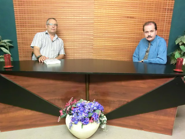 Momentos de la grabación del programa «El Enfoque» dedicado a la presentación del libro «La Natación en Canarias» José Luis López de Iniesta entrevista al profesor de la Ulpgc Rafael Reyes autor del libro. Este programa se emitirá el próximo Domingo día 20 de Julio en Canal 8 TV en la TDT a las 20.30 Horas.