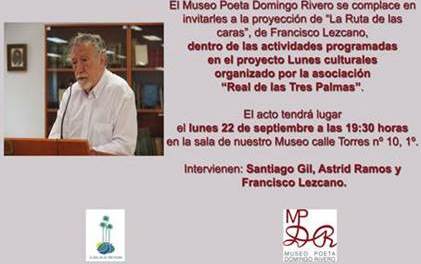 El próximo lunes, 22 de septiembre a las 19:30 horas, dará comienzo la temporada de los Lunes culturales con la proyección de «La Ruta de las caras», de Francisco Lezcano dentro del programa de actividades que desde comienzos de este año se están celebrando en la sala de nuestro Museo y que organiza la asociación el Real de las Tres Palmas.