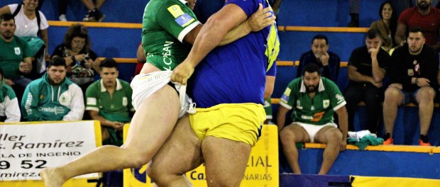 Roque Nublo, 15., Unión Gáldar/CC y de Ocio 7 Palmas, 18, arbitrando Félix Travieso. El club del Cruce de Arinaga acudió sin tres luchadores y con la baja por sanción de Norberto Morales, circunstancias que pusieron el marcador favorable al Unión Gáldar por 1-7, 7-10 y 10-15, ganando la eliminatoria tras el 18-13 de la ida para los norteños.