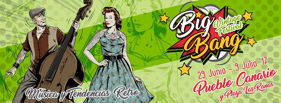 El grosso del Big Bang Vintage Festival llegará el viernes 7 de Julio al Pueblo Canario, donde hasta la tarde del domingo 9, podrás asistir a conciertos (Rockabilly, Rock’n’Roll, Swing, DooWoop, JumpBlues o Western & Swing), sesiones Dj en vinilo, shows de cabaret burlesque, mercadillo vintage, exposiciones de cine, peluquería, tattoo, talleres de baile retro, concursos de baile o pin up, food trucks, talleres infantiles y un largo etcétera de actividades destinadas a todos los amantes de la cultura de los años 40, 50 y 60.