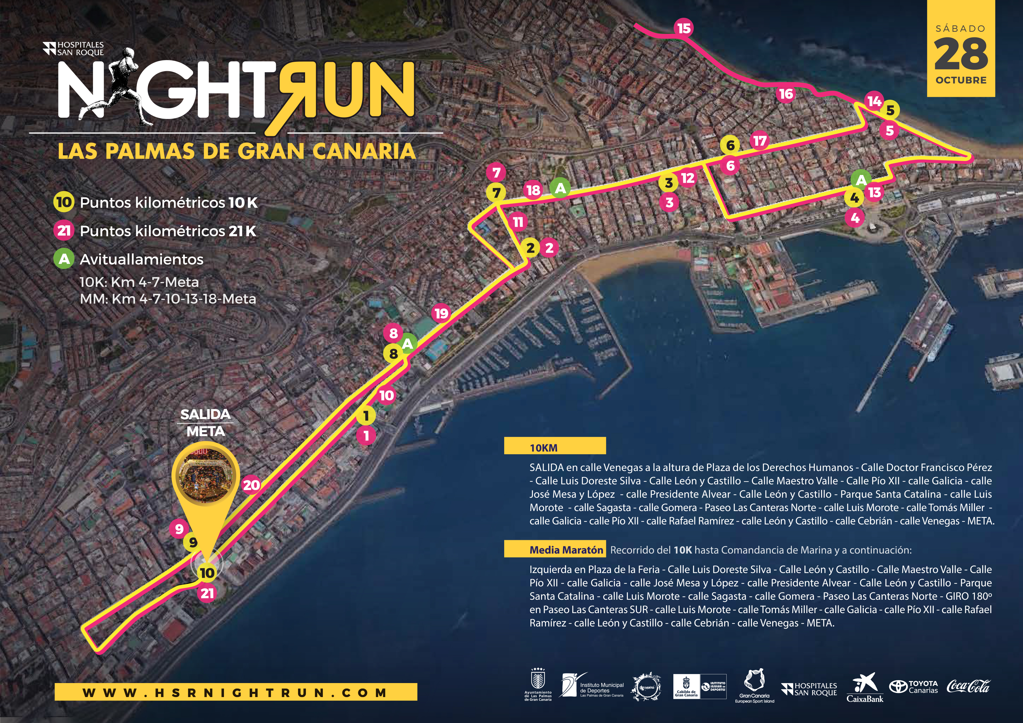 La distancia del 10 Km. contará con 3 puntos de avituallamiento en los kilómetros 4, 7 y meta; mientras que el Medio Maratón tendrá 6 en los puntos kilométricos 4, 7, 10, 13, 18 y meta.