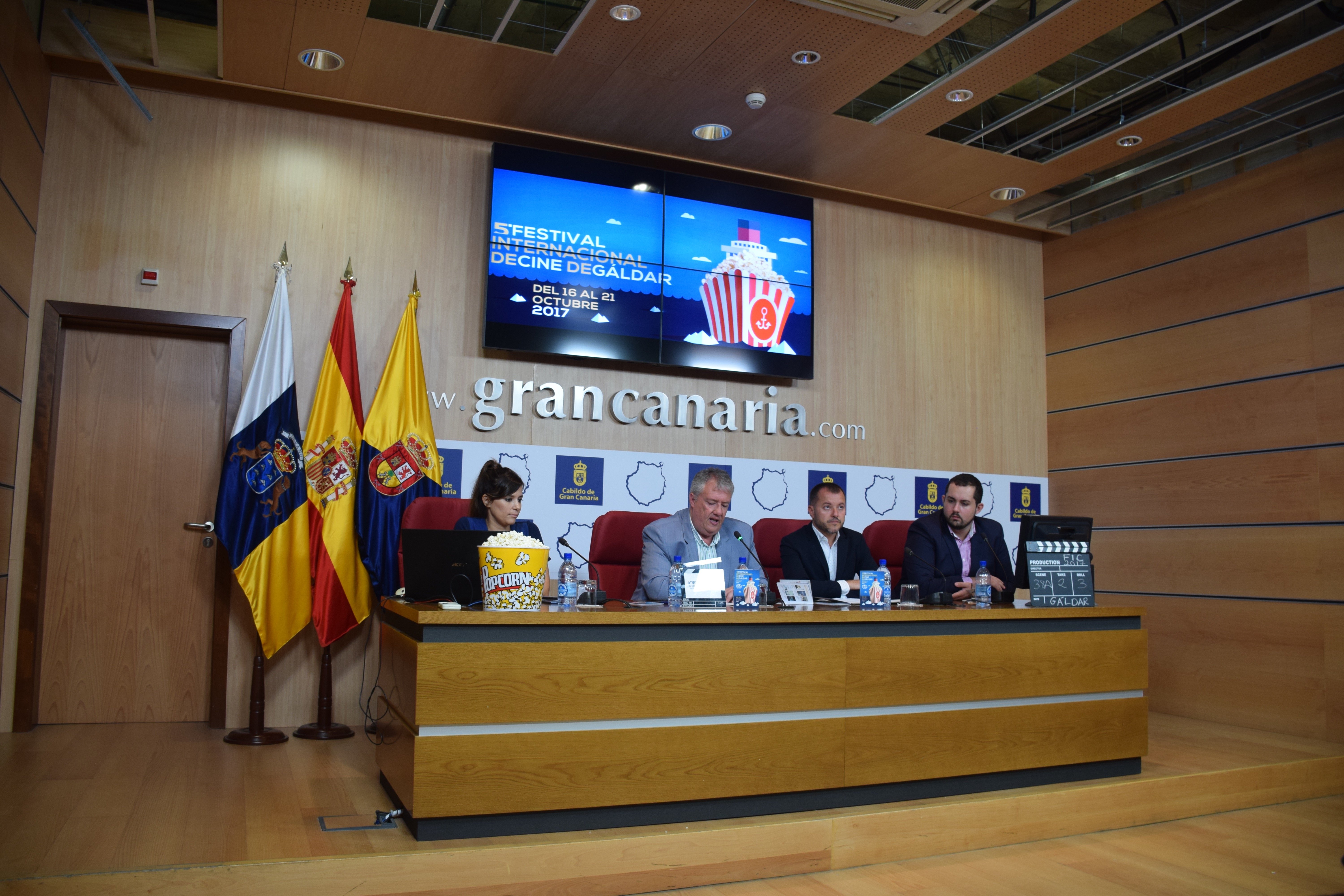 El Festival Internacional de Cine de Gáldar ha presentado esta mañana la programación de su V edición en una rueda de prensa celebrada en el Edificio Insular I del Cabildo de Gran Canaria. Con la presencia del D. Carlos Ruiz, Consejero de Cultura del Cabildo de Gran Canaria; D. Teodoro Sosa, Alcalde del Ayuntamiento de Gáldar; D. Julio Mateo, Concejal de Cultura del Ayuntamiento de Gáldar y la Directora del Festival Internacional de Cine de Gáldar, Dña Ruth Armas se han mostrado las novedades de esta nueva edición que se celebrará entre el 16 y el 21 de octubre de 2017 en la villa de Gáldar.