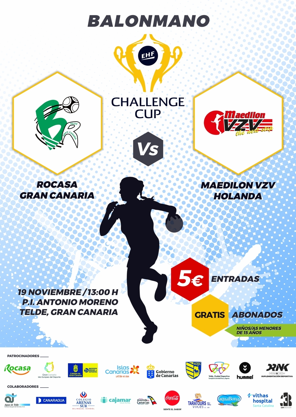 Retransmisión en Directo para toda España del encuentro de vuelta de dieciseisavos de Final de la Challenge Cup entre el Rocasa Gran Canaria Ace y el Maedilon VZB Holandés que se disputará en el Pabellón Municipal Antonio Moreno de la Ciudad de Telde el día 19 de Noviembre.