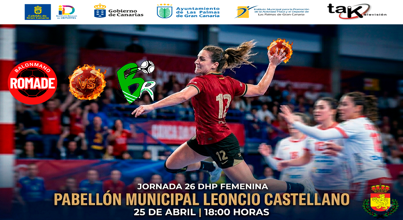 Retransmisión en directo de la XXVI Jornada del Campeonato Estatal DHP disputada entre el Club Deportivo Balonmano Romade y el Club Balonmano Rocasa Gran Canaria en el Pabellón Leoncio Castellano el pasado Sábado 25 de Abril de 2026 a las 18.00 Horas.